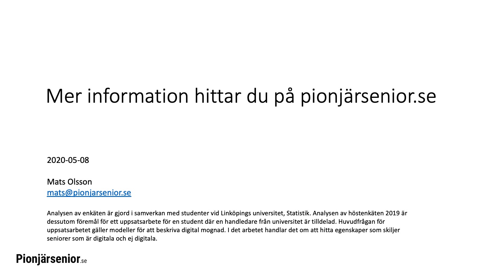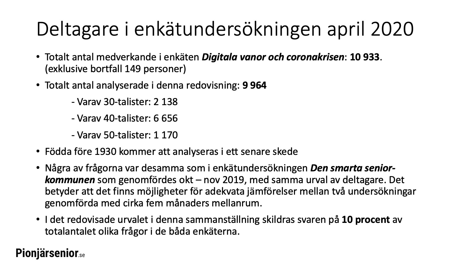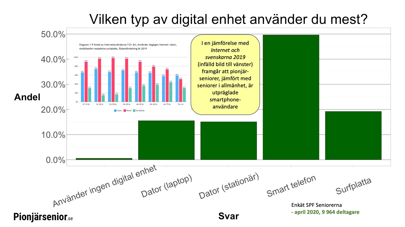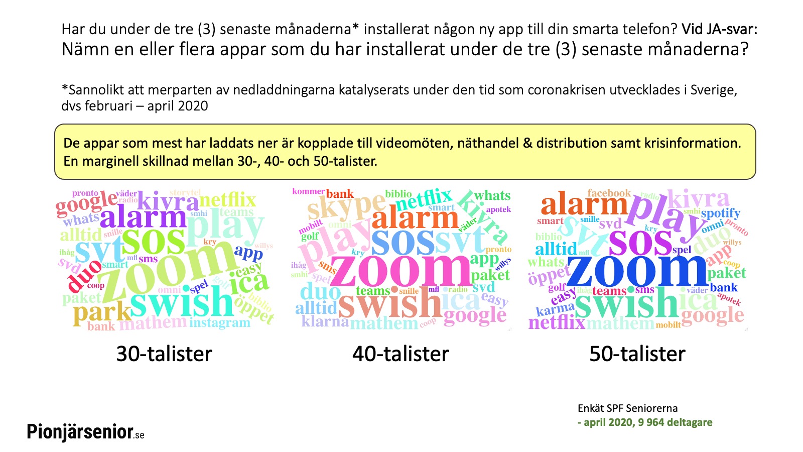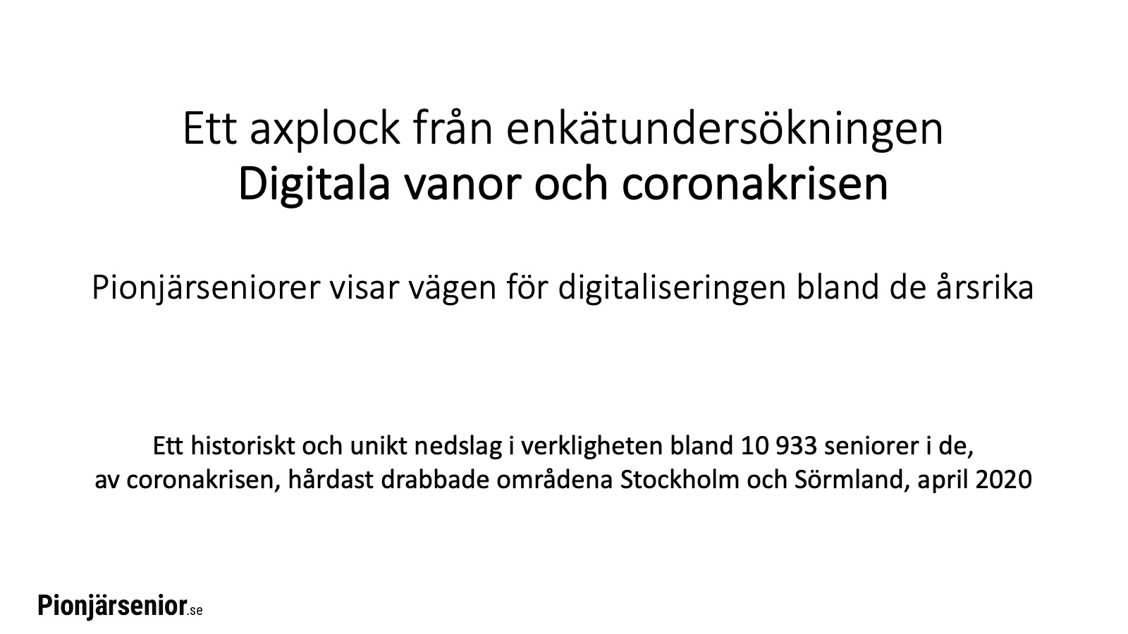 Ett axplock från enkätundersökningen Digitala vanor och coronakrisen. Ett historiskt och unikt nedslag i verkligheten bland 10 933 seniorer i de, av coronakrisen, hårdast drabbade områdena Stockholm och Sörmland, april 2020