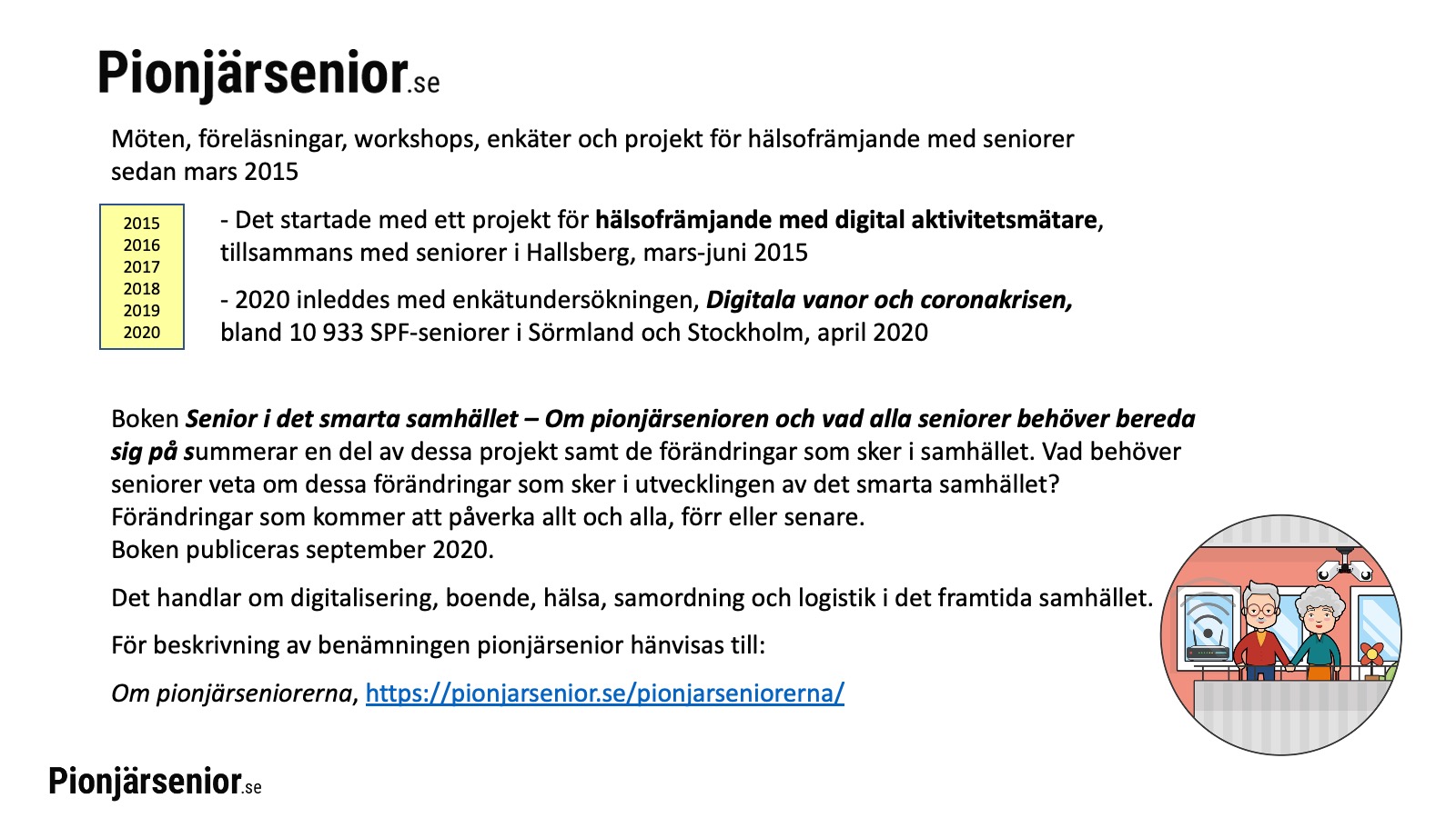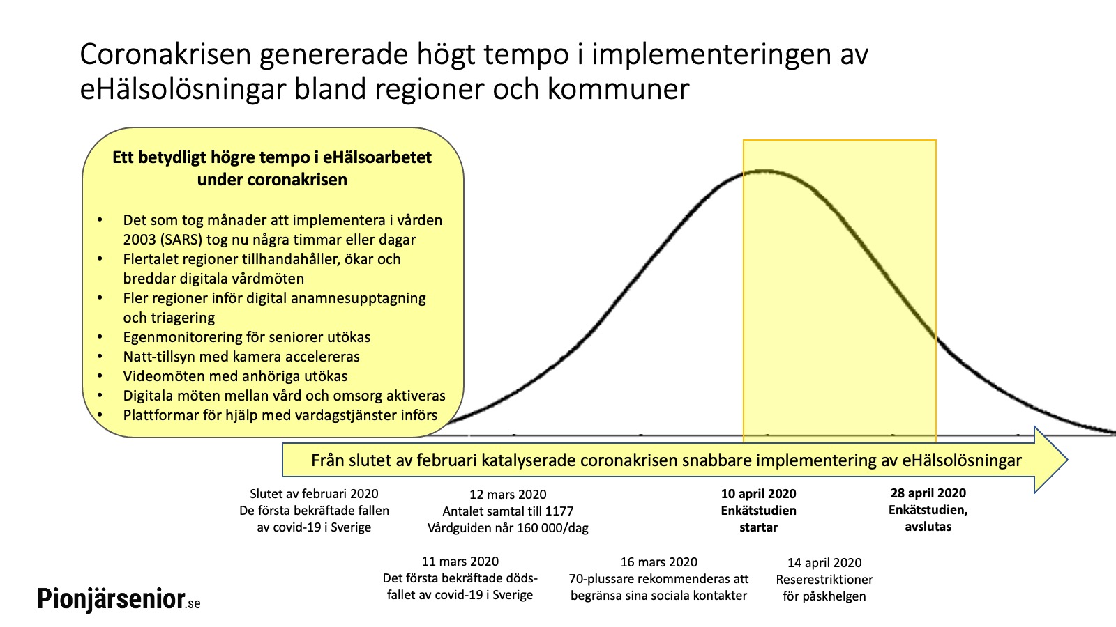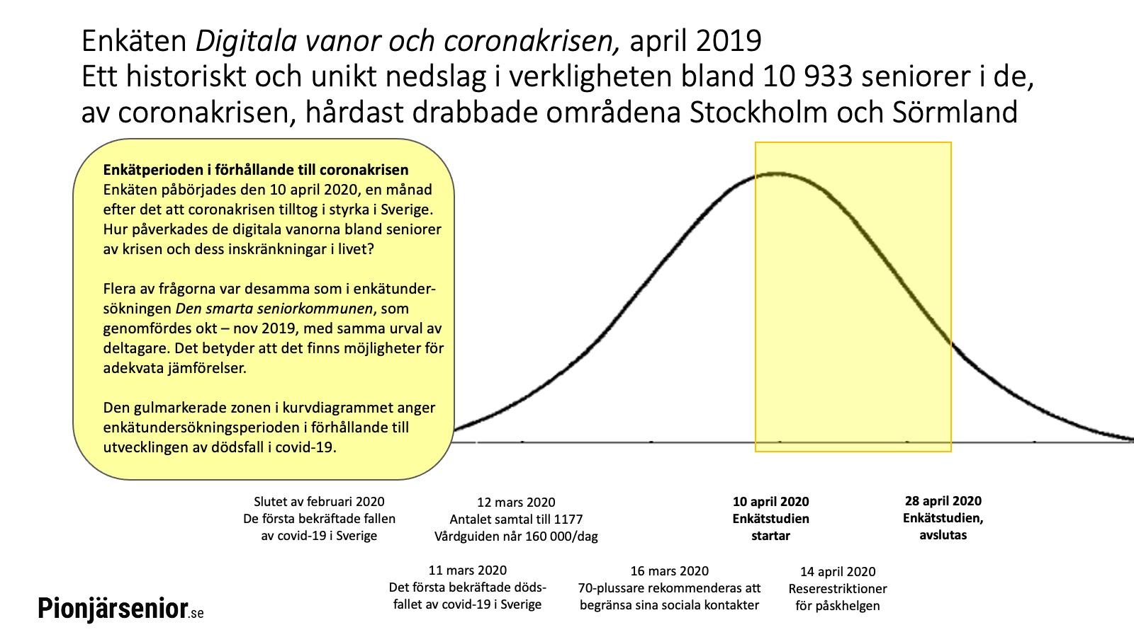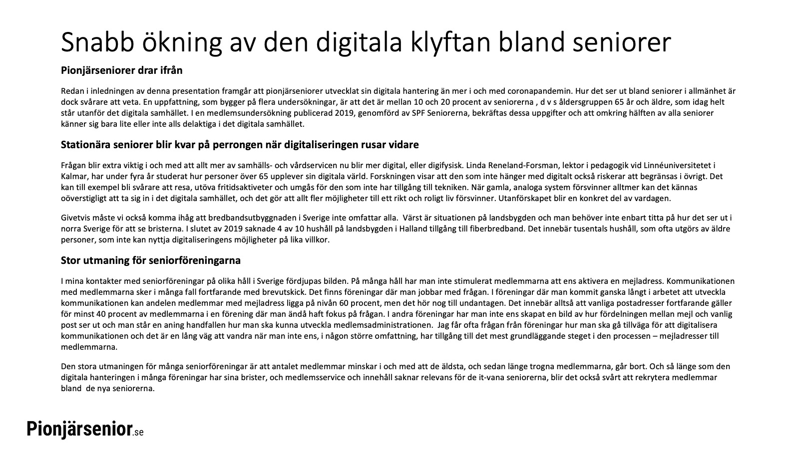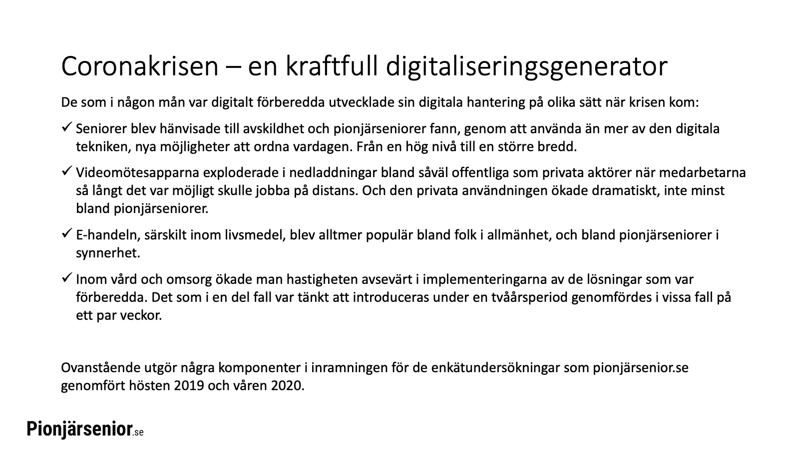 I och med coronakrisen blev seniorer hänvisade till avskildhet och pionjärseniorer fann, genom att använda än mer av den digitala tekniken, nya möjligheter att ordna vardagen. Pionjärseniorerna gick från en hög nivå till en större bredd.